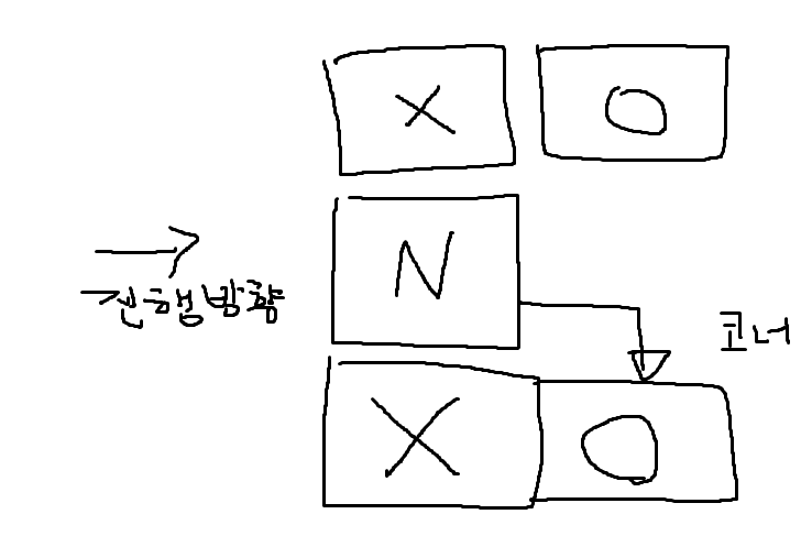 1. 가던 방향을 확인(즉 parent로 부터 나와의 방향) -> 필수 2. 가는 방향 기준 왼쪽에 코너라면 가는방향 기준 왼쪽 대각선 확인 -> 조건에따라 3. 가는 방향 기준 오른쪽에 코너라면 가는방향 기준 오른쪽 대각선 확인 -> 조건에따라