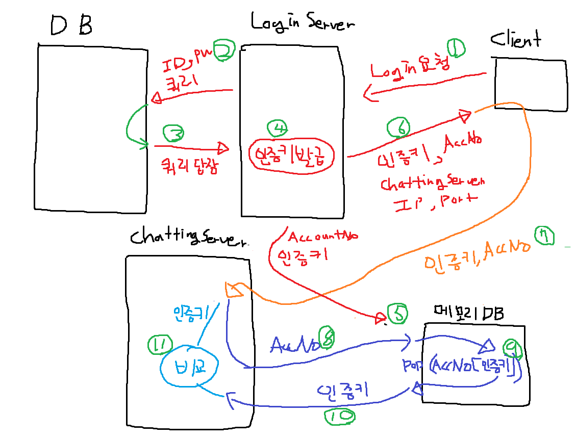 그리고 채팅서버는 받은 정보를 기억해뒀다가 클라이언트가 보내는 인증키와 비교하는 일련의 작업을 마치면 로그인이 완료되는 과정입니다.