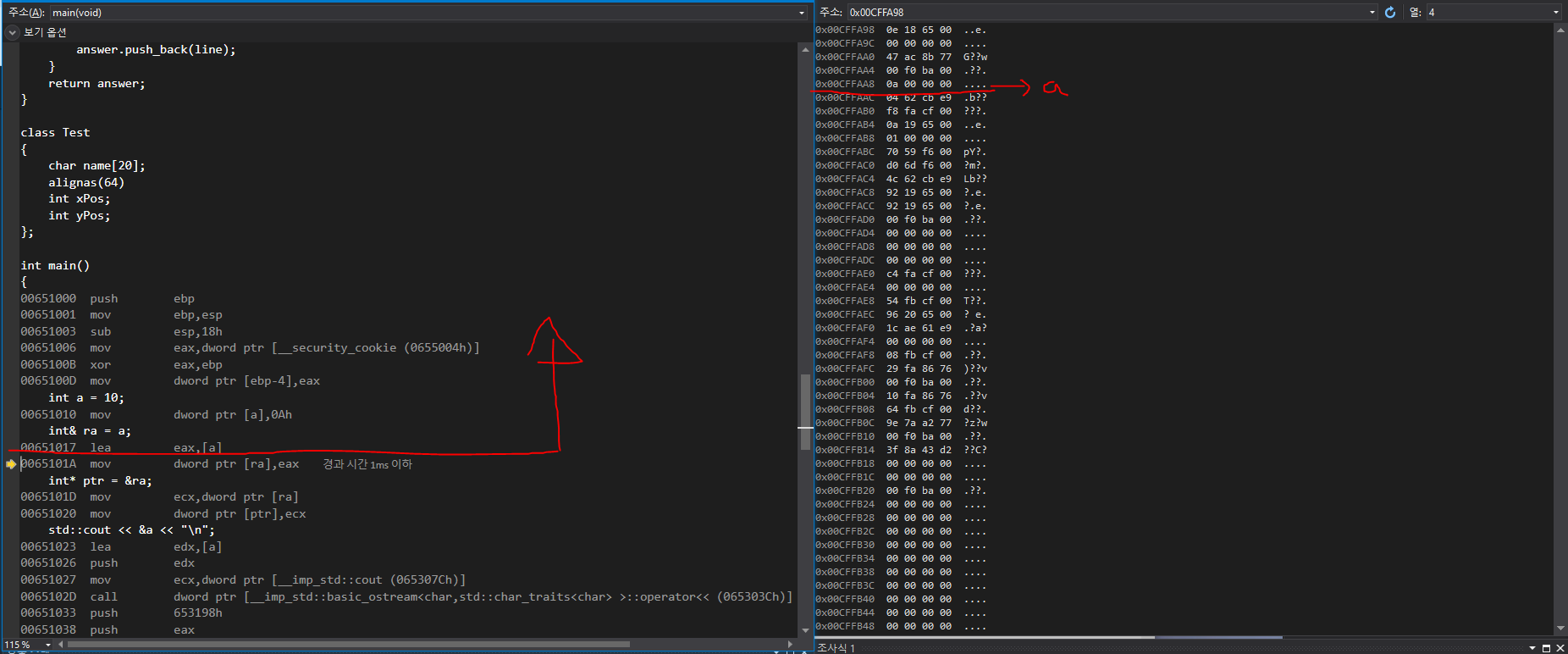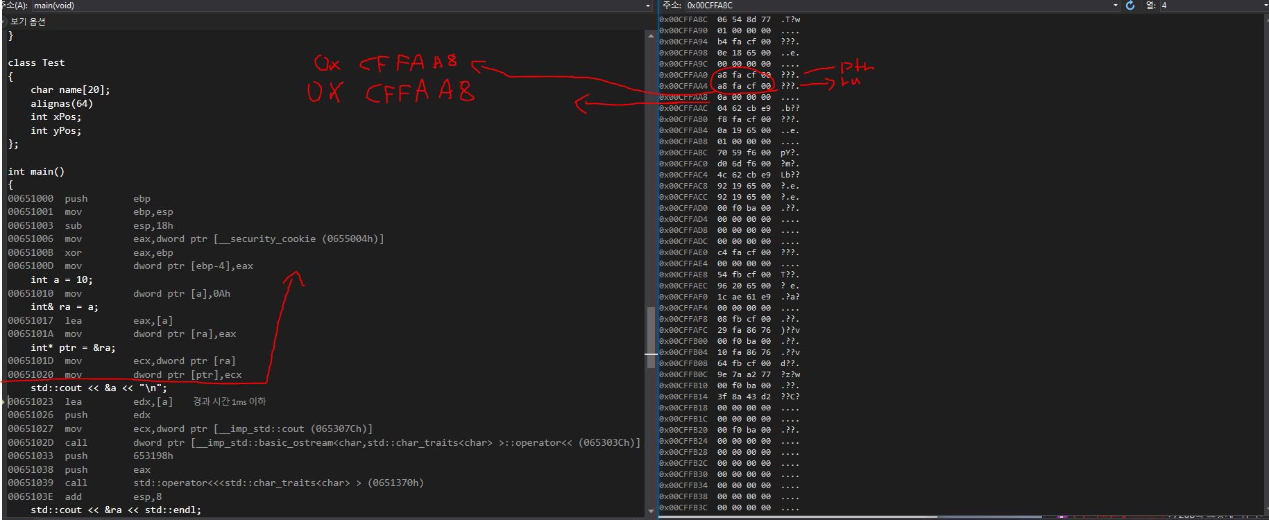 네... 그럼 포인터는 레프런스냐 라고 묻는 분 계실텐데요... 음... 정확히는 똑같다 라고는 할 수 없습니다... vs의 경우에는 거의 완벽하게 동일하게 작동하지만 아까 말씀드렸듯... c++에서 레프런스의 구현은 Unspecified라고 정의하고 있습니다. 그렇기때문에 똑같다 라고 한다면 답은 아닙니다.